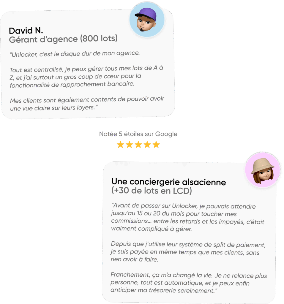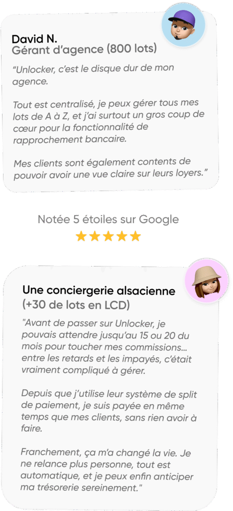 Elle s’adresse aux conciergeries et aux agences immobilières qui souhaitent simplifier et développer leur activité. Avec Unlocker, vous centralisez toute votre gestion locative (baux, encaissements, relances, quittances…) et profitez de services exclusifs comme la délégation de carte G, le split de paiement et l’automatisation de vos processus.