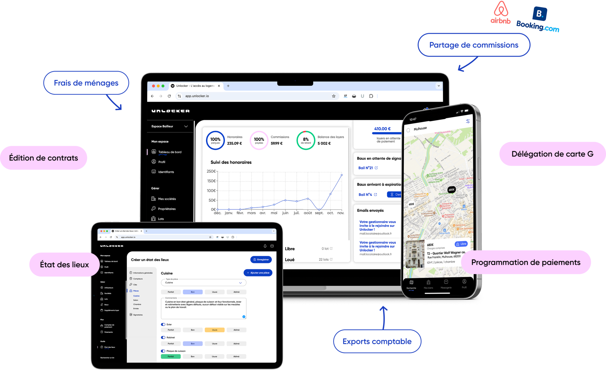 Unlocker, la plateforme de gestion locative tout-en-un qui permet aux conciergeries et aux agences immobilières de générer des revenus récurrents. Automatisez la gestion locative de vos biens de la courte à la longue durée, et développez votre activité sans efforts supplémentaires.