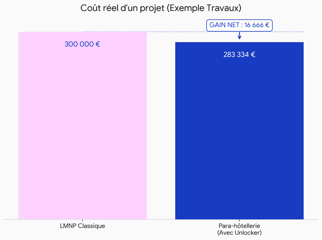 Si vous le gérez en LMNP classique, le coût réel des travaux est de 100 000 €. Si vous le structurez en para-hôtellerie (assujettissement à la TVA), il peut demander le remboursement de la TVA sur les travaux.