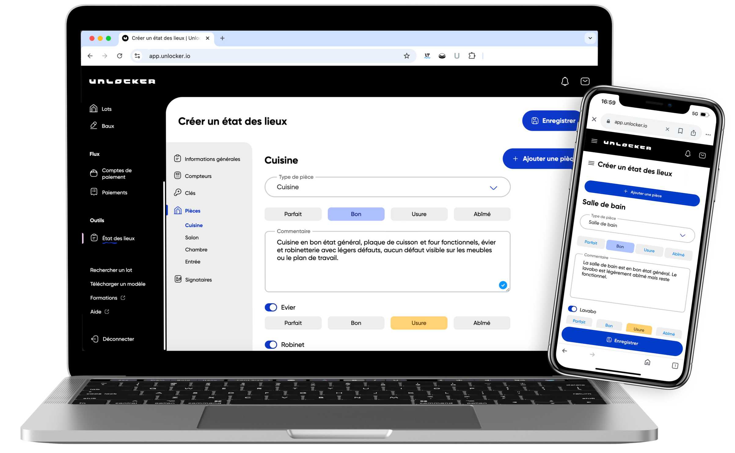 Créez des états des lieux complets et professionnels facilement depuis votre ordinateur ou mobile via l’interface Unlocker.