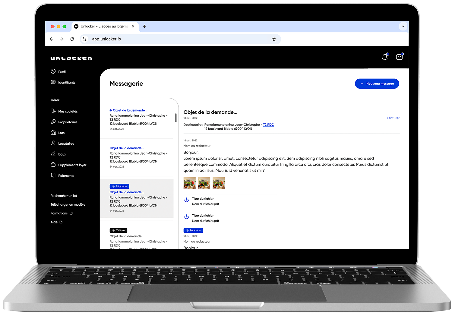 La messagerie Unlocker centralise les échanges avec les locataires et les propriétaires. Les conversations restent professionnelles, traçables et accessibles à tout moment.